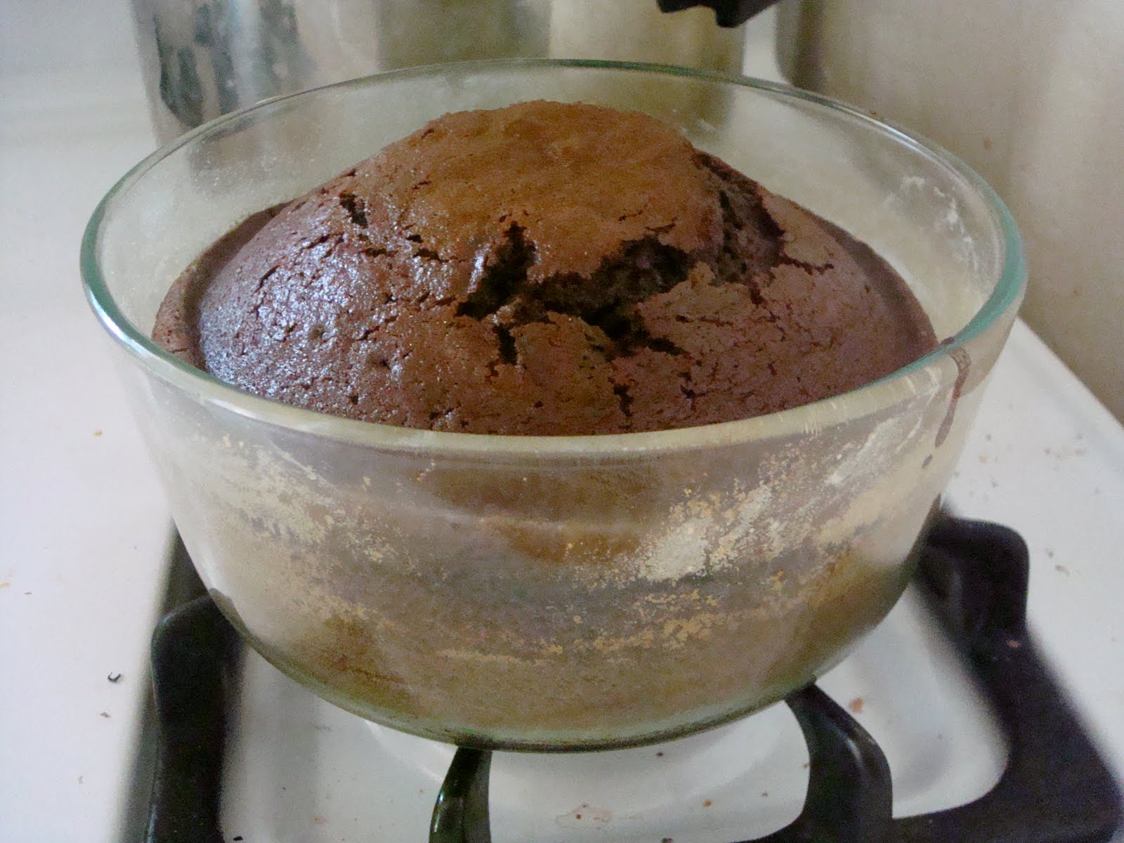Preheat oven to 350˚F. Grease and flour a cake tin, either one 9" tin or a deeper pyrex glass bowl will do.