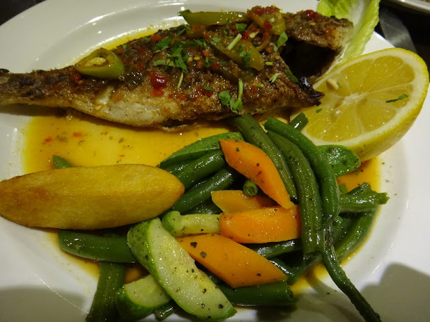 We sat down at the restaurant and had fish, caught that day in Red Sea, along with wine and various breads and dips. The fish was prepared "harra," which means hot/spicy, with red peppers, green peppers, cilantro, garlic, and whatnot (see image below). We had white wine made in Jordan, which was quite delightful, from a vineyard call Zumot. This is what life is about. Sharing a nice meal with people you love. Sharing stories and experiences and just enjoying whatever life has to offer. I wish that for you.
