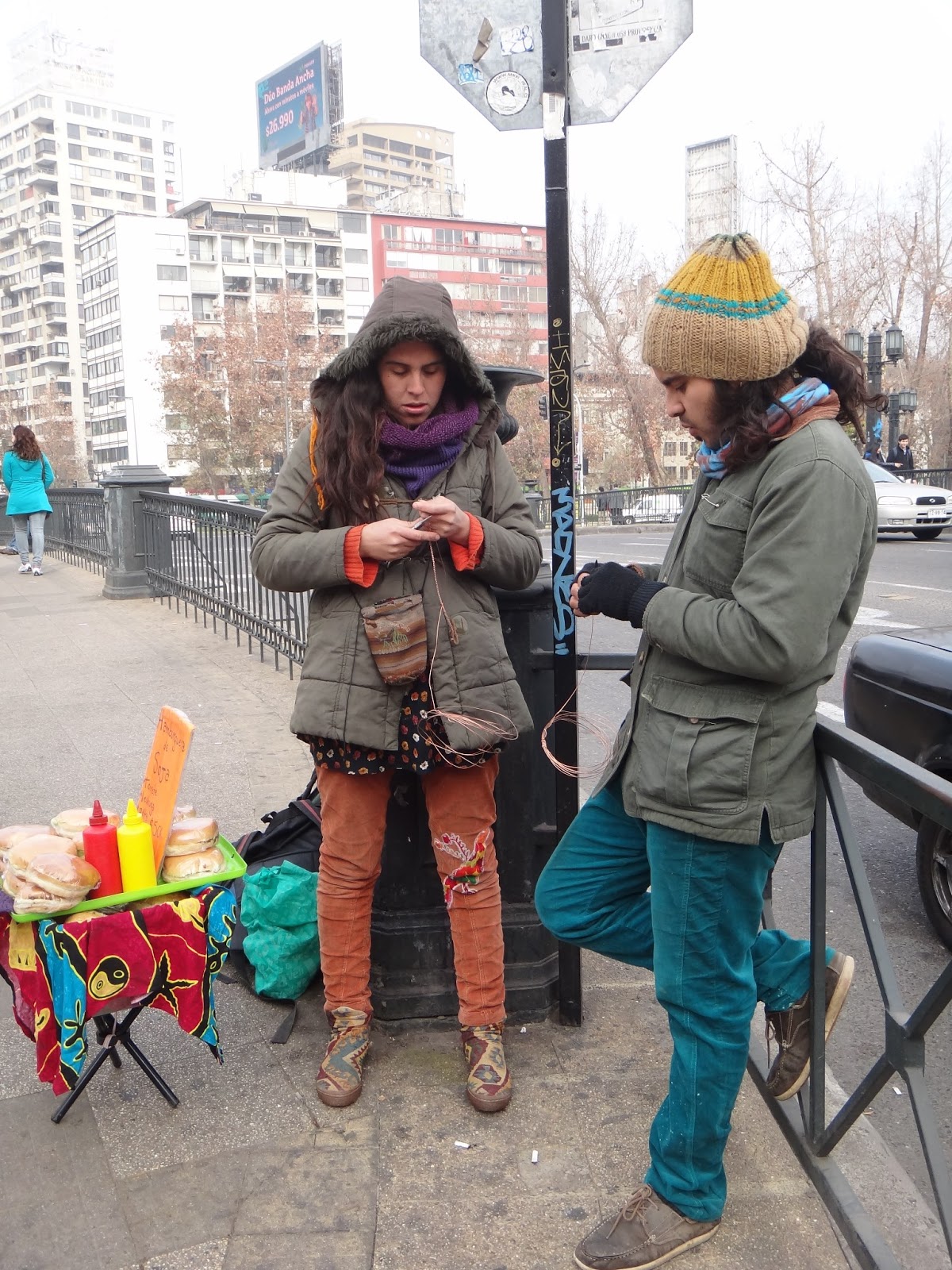We cross the river, there's lots of cool (and politically loaded) graffiti on the sides of the river. There are people with blankets on the ground selling things, socks, angry bird beanies, phone adaptors, you name it. At the end of the bridge there is a couple making copper chains and selling sandwiches. This is very common I have found in Chile, people walk around with tupperwares selling "soy hamburgers" or sandwiches. We stop and watch them at work and introduce ourselves, they are Lauren and Leo a sweet couple who let me take their pictures.