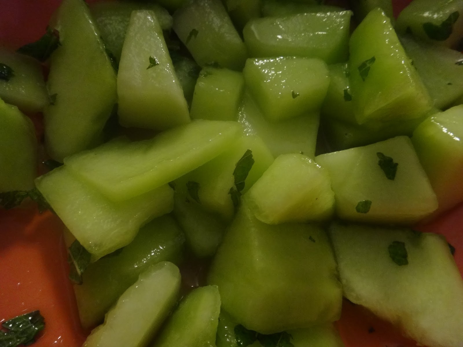 | Dessert was honeydew (farmer's market) with lime (farmer's market) squeezed on it and fresh mint (aunt's yard)...refreshing! |