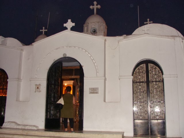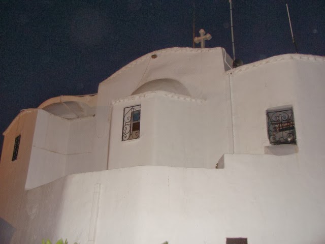 We walked alongside the parliament and then up through Kolonaki, a very nice neighborhood in Athens. Kolonaki is on a steep slope and we walked up the hill passing through restaurants, that had sidewalk seating. About halfway up the hill the road turned into stairs and we were walking up stairwells between residential buildings. The road was lined with lush, green trees; that is one thing (of many) that keeps amazing me, the fertility of the land here. There is allegedly a water shortage but there are foliage and plants everywhere! Eventually we made it to our destination, a funicular station that would take us up to St. George's church. The funicular was small and cramped and a wave of claustrophobia came over me as we ascended the hill in a dark tunnel; at one point there was a disco ball flashing lights from the walls of the tunnel...seriously, guys? There is the most adorable white church on the top of the hill, a bell tower and a restaurant. We visited the church which fits about 12 people. There was a priest chanting and later incensing and an elderly nun praying. We lit candles and said a small prayer and were off. The view from St. George's church is incredible, you can see all Of Athens - whose population is 4 million (of the 11 million of all of Greece).
