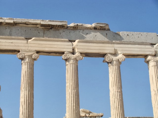 The Acropolis: we climbed up to the Parthenon and were given a lesson by Dorothy: the marble used to be painted, we are thankful that the Romans copied us because we know what the statues (that the Byzantines took and used for other things) looked like, much of the decoration of the Parthenon is in the British museum or the Louvre in Paris, etc etc. Next we visited the New Museum of the Acropolis (in which photos are prohibited except on the 3rd floor, which is dedicated to the Parthenon). One small detail that caught my eye was that in the entrance of the museum exhibit, there was a clear glass plate in the floor (the entire floor is glass but it is etched, this particular plate was clear and you could see underneath); there was sand and some ancient, very well-preserved pottery. Dorothy explained that this is a Greek tradition, when you start the construction of a building, you always put something close to you, from the kitchen in the foundation. I really liked that tradition - very symbolic.
